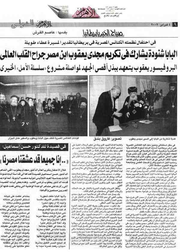 Pope Shenouda Honours Prof. Sir Magdy Yacoub, Ahram 2002