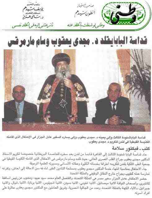 Pope Shenouda Honours Prof. Sir Magdy Yacoub, Watan 2002